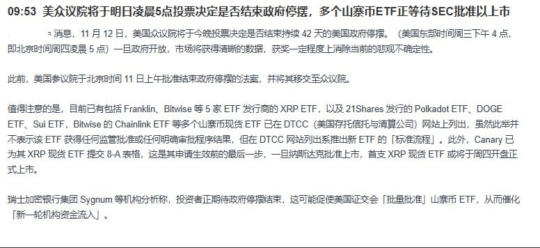 Tonight at 12 o'clock, the U.S. House of Representatives will vote to end the 42-day government shutdown. Once the shutdown ends, market data will become clear, and pessimistic sentiment can dissipate by a large margin. Even more explosive is the progress of the XRP ETF: Canary's XRP ETF has submitted its final step, and it may be listed when the market opens on Thursday! Swiss institutions say that once the shutdown ends, there is a high probability that ETFs will be batch approved, and institutional funds will rush in.