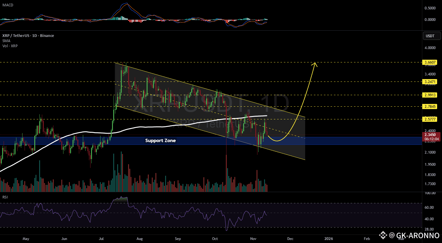 XRP is moving inside a bullish flag on the daily chart. Consider buying around the support zone. For the bullish scenario, the price must hold inside the flag; therefore, two consecutive daily candle closes below the flag will invalidate this analysis.