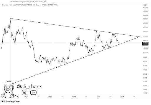 The current price of $16.09 positions LINK just above its long-term ascending support but below heavy resistance. This range marks a “no-trade zone,” as analyst Ali emphasized, meaning traders await a confirmed breakout before taking new positions. The chart uses Binance perpetual contract data, highlighting how LINK’s price has gradually formed a symmetrical triangle — a pattern that often precedes large market moves.