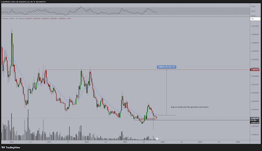 Chainlink (LINK) has been rising consistently since the middle of 2022, creating a trend of higher lows. This demonstrates that buyers are regularly taking over. Conversely, the market is under a long-term squeeze because the upper resistance line links multiple lower highs since 2021. Price fluctuations have decreased as a result, indicating a tightening market.