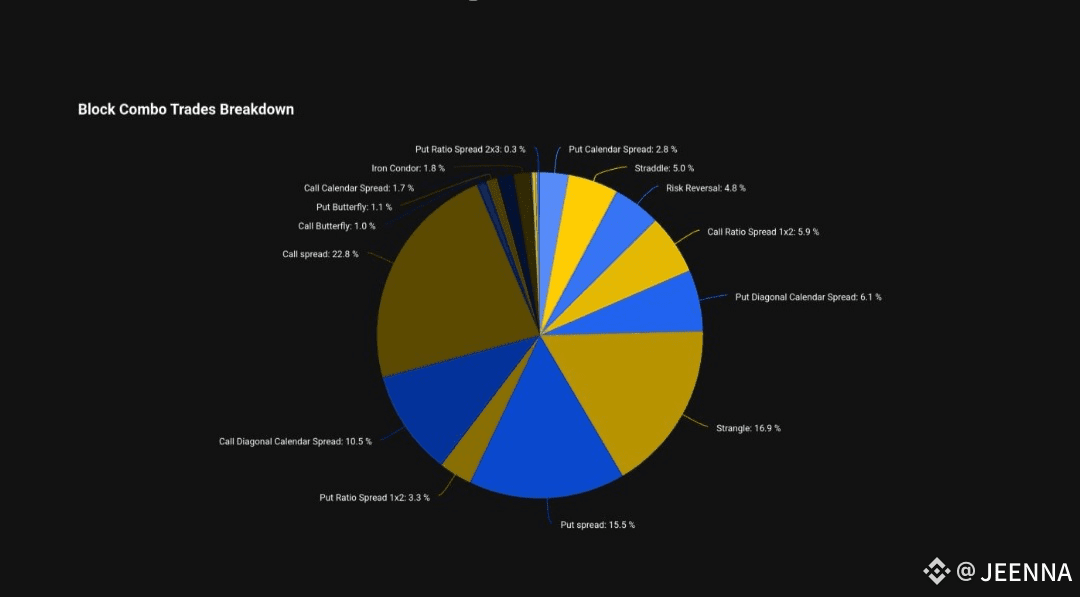 According to recent block trade data from Deribit, the world’s largest crypto options exchange, large Bitcoin investors have been loading up on non-directional volatility strategies. Over the past week alone, strangles accounted for nearly 17% of Bitcoin option blocks, while straddles made up another 5%. Combined, that means more than one-fifth of all block flows are tied to strategies designed to profit from big moves—regardless of direction. It’s a striking sign that institutions are positioning for action without committing to a specific bias.