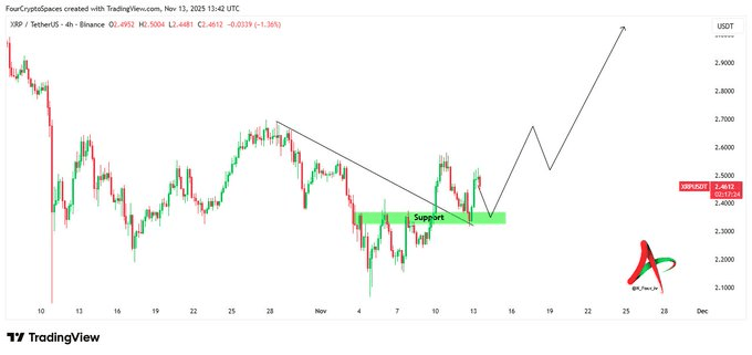 A chart shared by FOUR | Crypto Spaces (@X_Four_iv) illustrates this development. The asset successfully retested the trendline, now turned support, forming a higher low that reinforces the new trend direction. The support region between $2.30 and $2.35 combines both horizontal and dynamic levels, often seen as zones of liquidity where larger players accumulate positions before a new price leg.