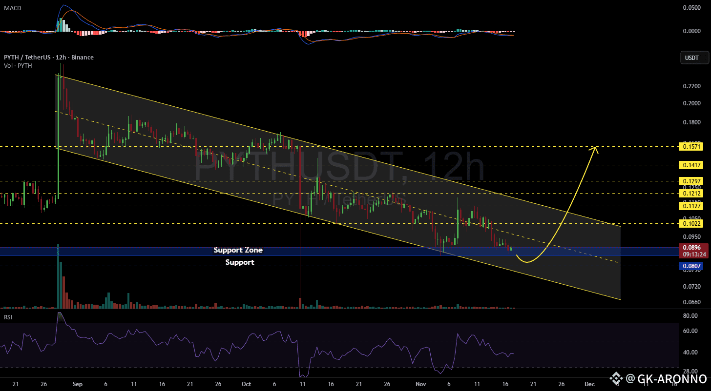 PYTH is moving inside a descending channel on the 12H timeframe. It is currently sitting on the support zone. Consider buying a small bag here and another near the $0.0807 support level in case of a deeper dip.