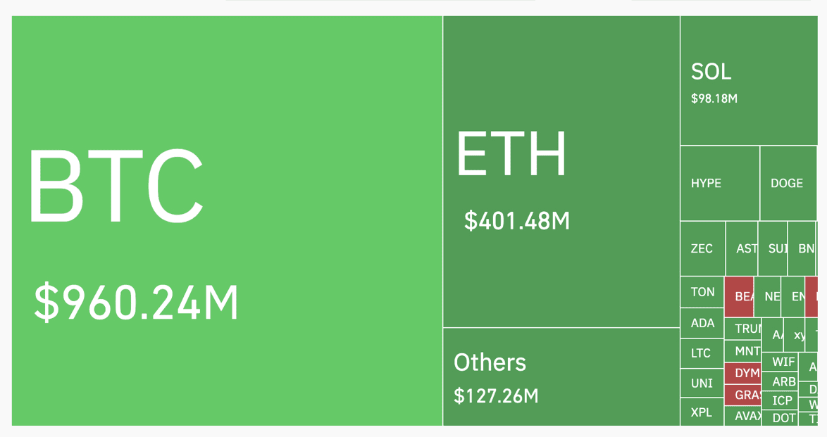 Bitcoin led all liquidations, accounting for $929 million of a total of $960 million in long positions. Ethereum (ETH) followed with $403.15 million, again primarily from long positions driven by leverage.