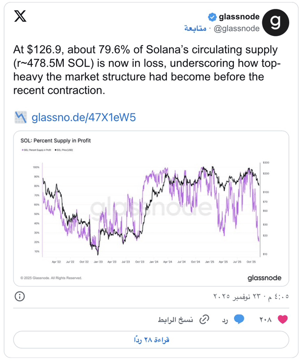 These losses are part of a larger market downturn. Glassnode data reveals that approximately 79.6% of the circulating supply of SOL—around 478.5 million tokens—is currently being traded at a loss at a price of $126.9. These figures confirm how heavily the market was congested before the current downturn.