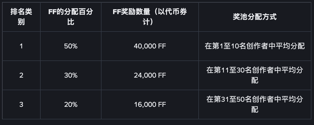 The top 50 creators will be eligible to share an additional prize pool of 80,000 FF. This reward is based on the ranking from the 7-day leaderboard on the day the event starts. The 80,000 FF reward will be distributed across three ranking categories as follows: