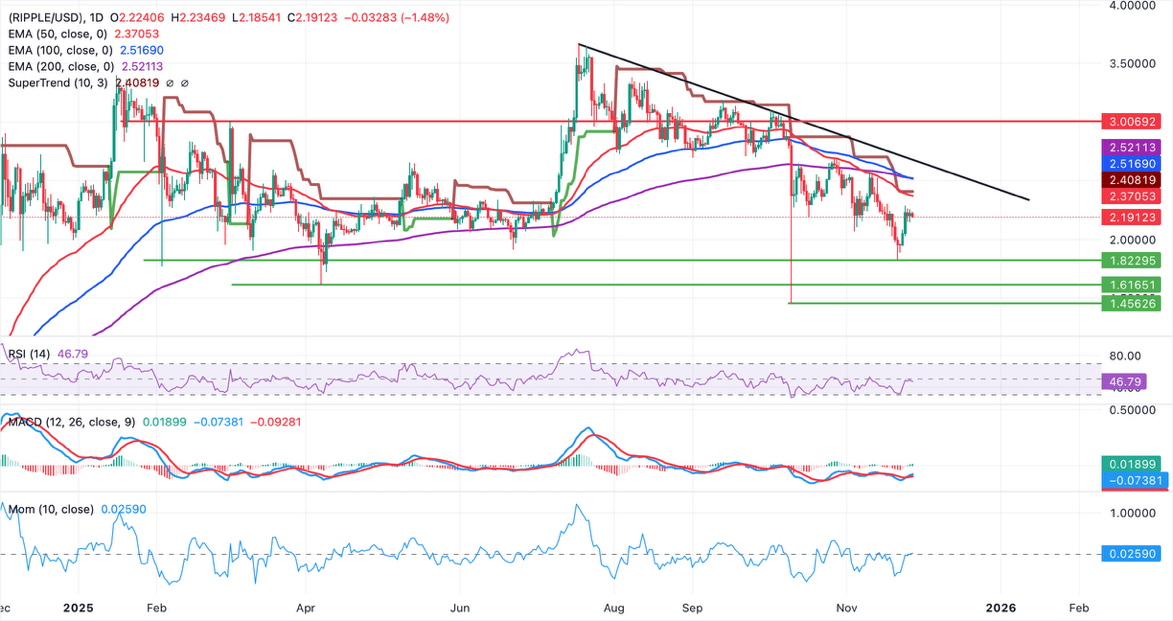 XRP is trading at $2.19 at the time of writing this report on Thursday, affected by ongoing bearish sentiment across the cryptocurrency market. The 50-day exponential moving average (EMA) at $2.37, the 100-day EMA at $2.51, and the 200-day EMA at $2.52 are trending downwards and remain above the price, maintaining bearish pressure.
