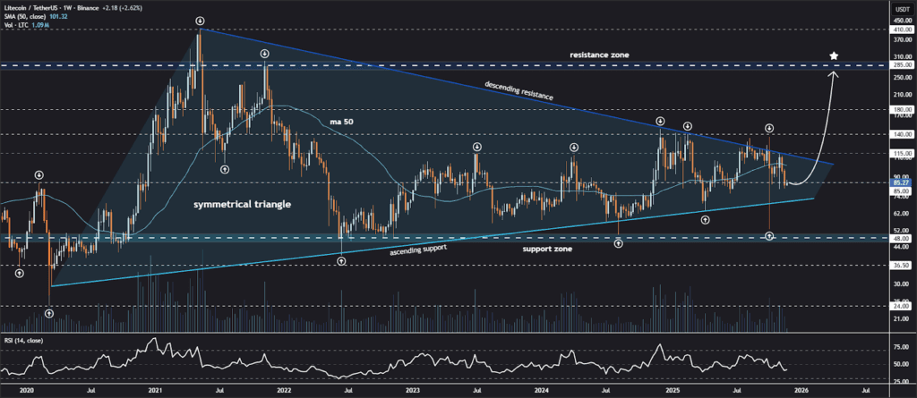 Litecoin’s weekly chart shows price compressing within the symmetrical triangle, bounded by descending resistance and ascending support. The formation has repeatedly respected both trendlines, indicating consolidation over an extended period.