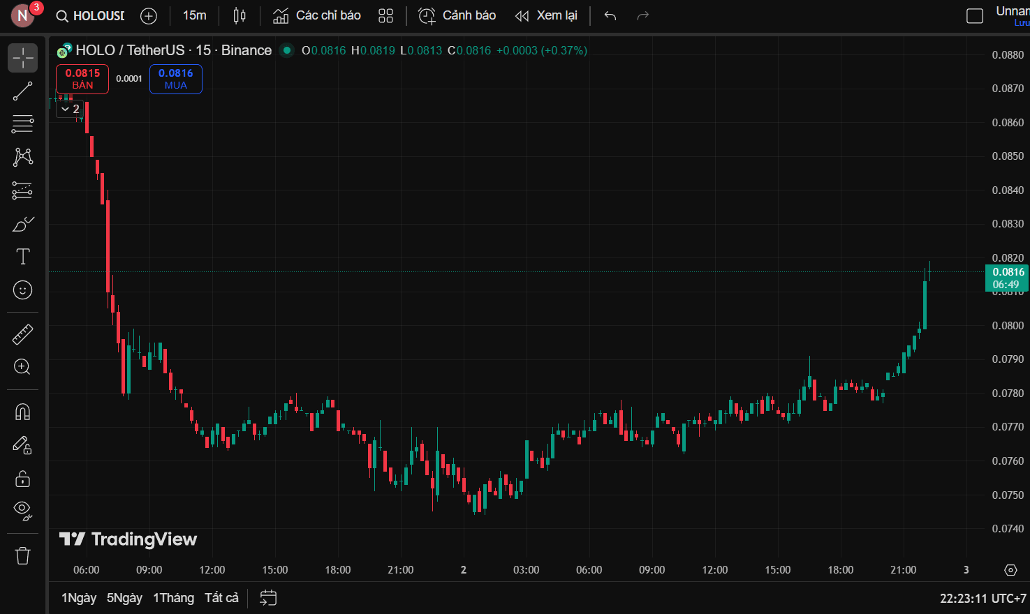 HOLO was pushed down to the 0.074 area, then crawled sideways persistently without breaking through any further. This is a very annoying accumulation style. But the recent direct jump to 0.0816 proves that the buyers have completed all preparations. There was no selling pressure, no force pushing back. This is a very clear signal for the wave opening.