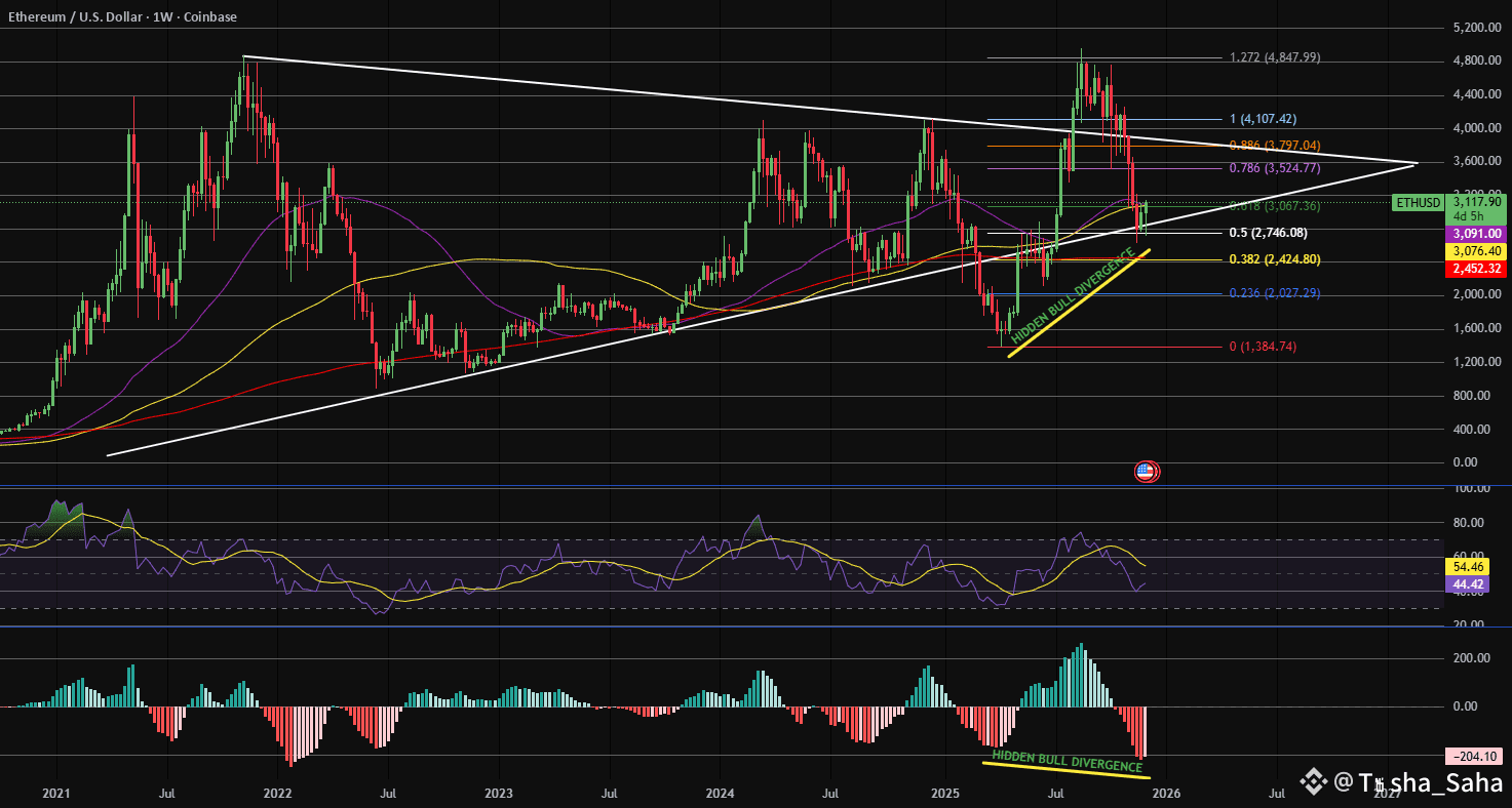 In addition, we have weekly hidden bullish divergence between the weekly MACD and weekly price action. Couple these 2 facts together, along w/ QT ending the 1st of Dec. 2025 and QE via liquidity injections coming soon, I find it hard to believe that Ethereum alongside major cap alt-coins will not rally.