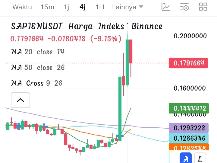 The chart shows a significant price spike towards 0.20 USDT, but the last candlestick confirms a strong rejection, indicating that profit-taking is underway.