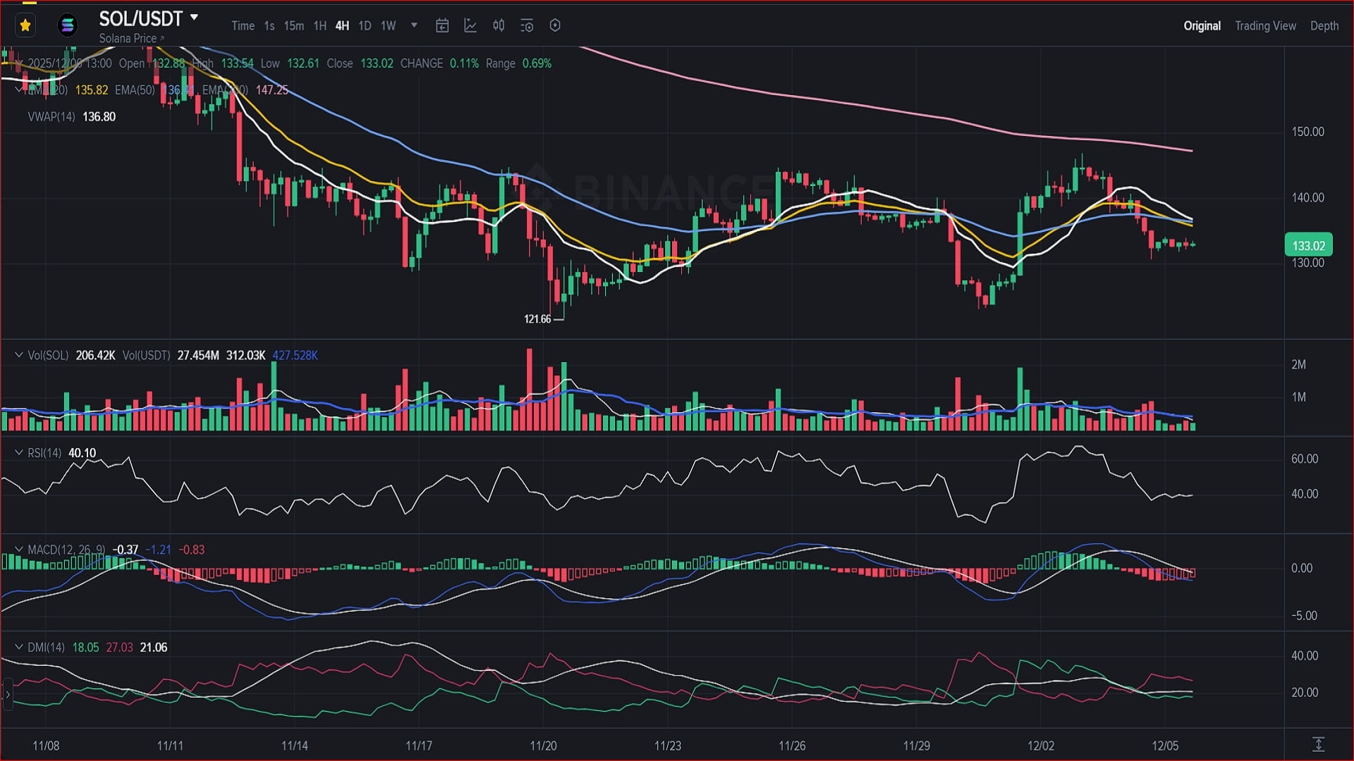 SOL is currently trapped below key resistance levels on the 4H chart. The price is trading under the 20 EMA (Yellow) and 50 EMA (Blue), facing a tough wall at $136 - $137. RSI at 40 indicates weak momentum. Bulls need to reclaim $137 to confirm a reversal; until then, the bias remains cautious with potential tests of lower support at $130.