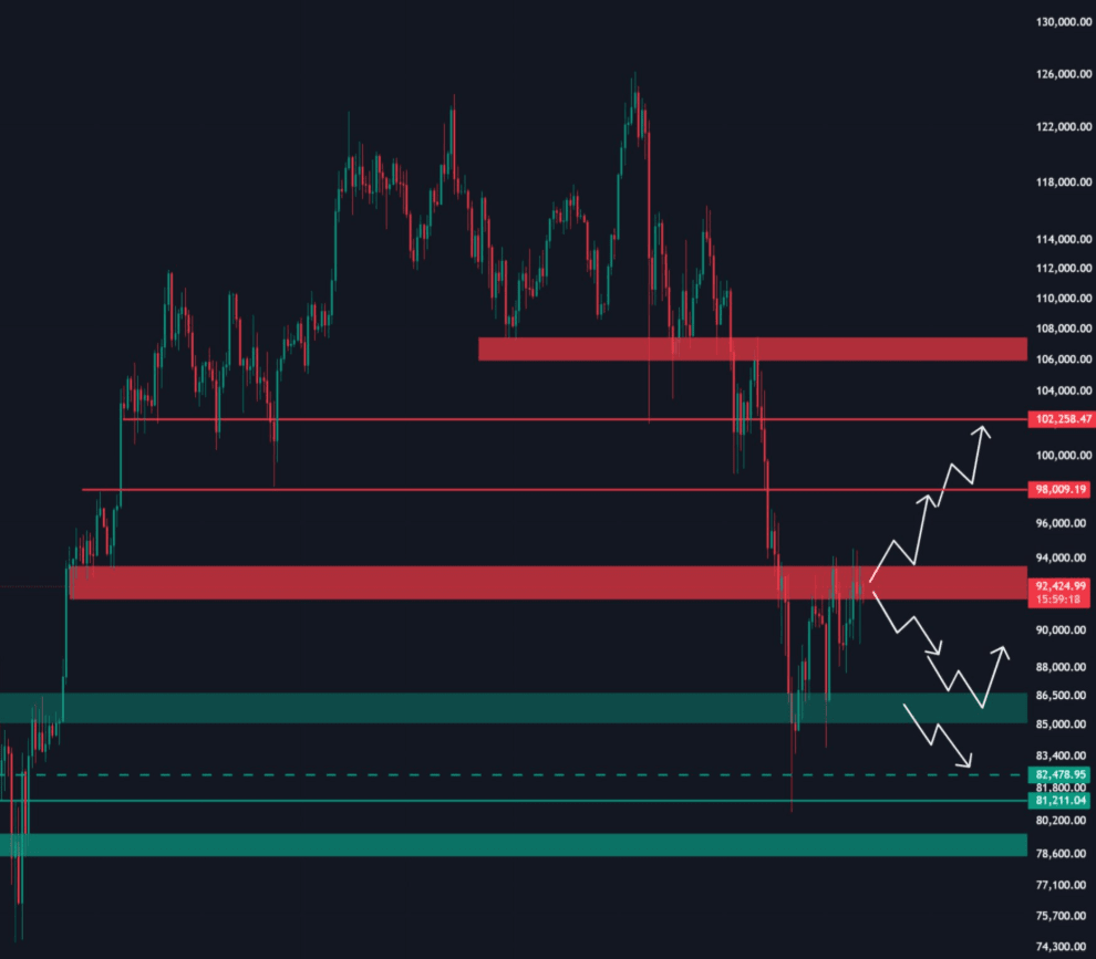 Bitcoin is currently trying to break through the resistance level of $92,000-$94,000. If the bulls can突破 this threshold, Bitcoin is very likely to rise all the way to $100,000. However, if it cannot break through, the price may drop below $90,000, and the success or failure in this critical range will determine the market's direction moving forward.