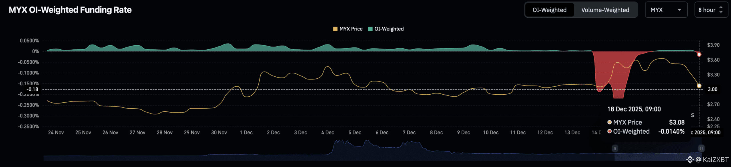 MYX traded near the lower boundary of an ascending channel, suggesting a temporary bullish structure. That positioning could allow a short-lived bounce.