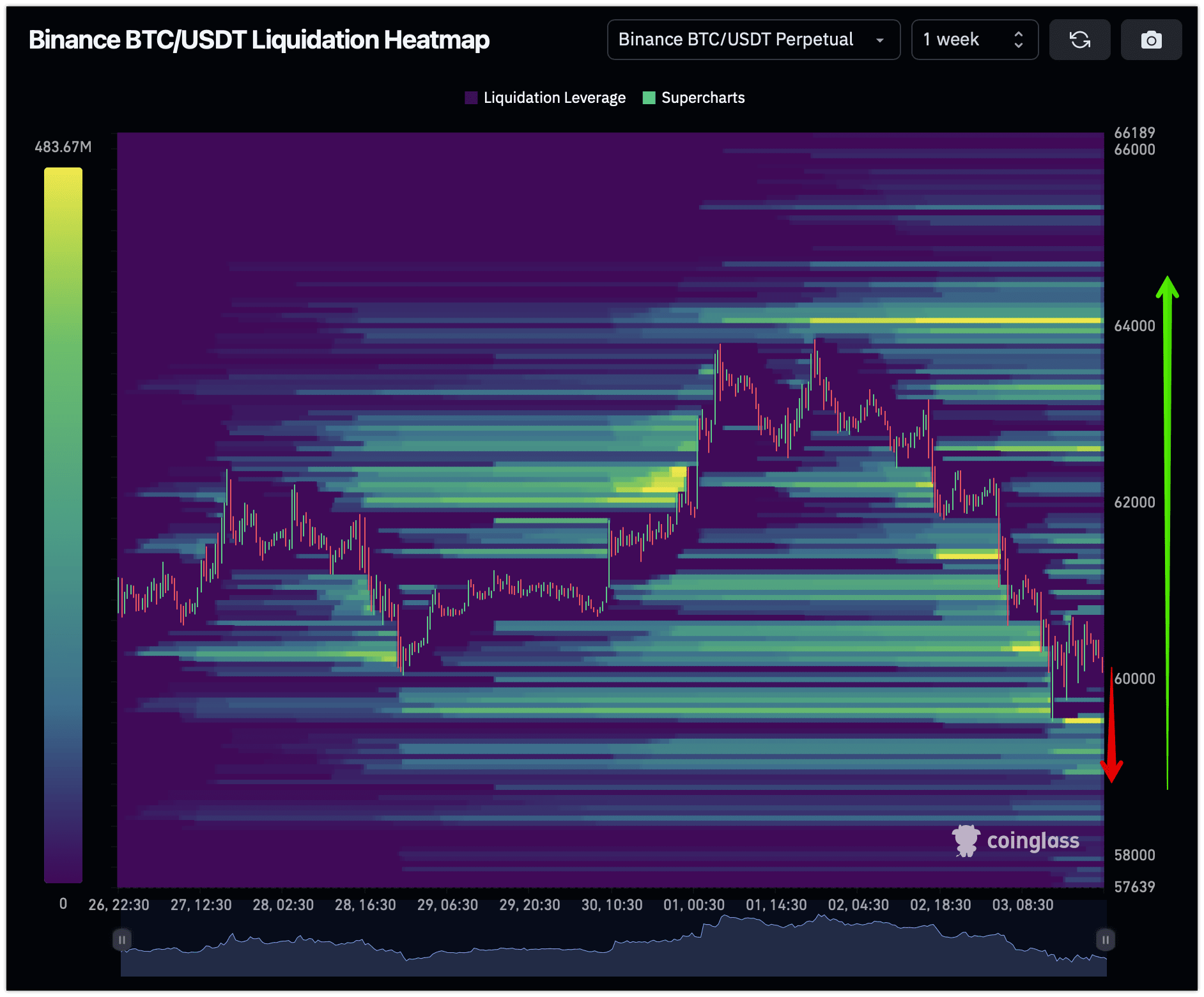 • Обсяги ліквідацій: Heatmap від Coinglass показує значні обсяги ліквідацій в діапазоні $60,000 - $62,000, що вказує на зони підвищеної волатильності.