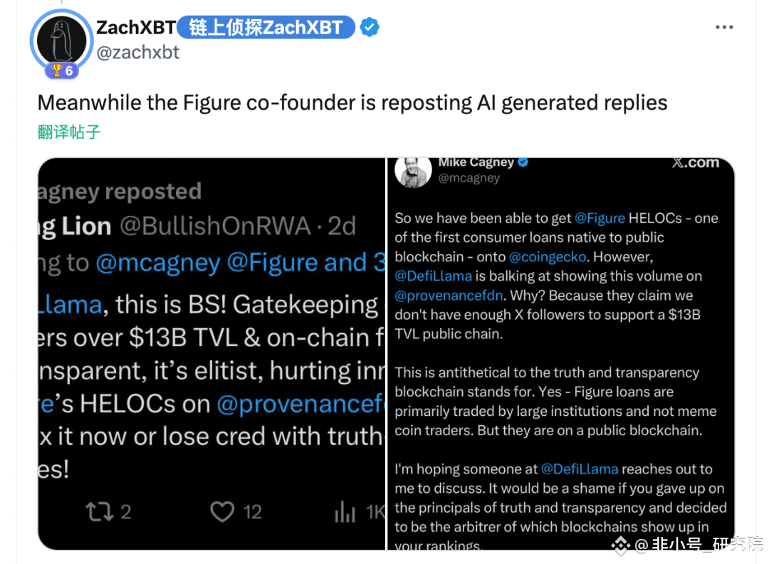 与此同时,ZachXBT 还注意到 Figure 联合创始人 Mike Cagney 不断转发一些疑似 AI 自动生成的“声援评论”,并公开点出这一点,进一步引发对 Figure 舆论操作的反感。