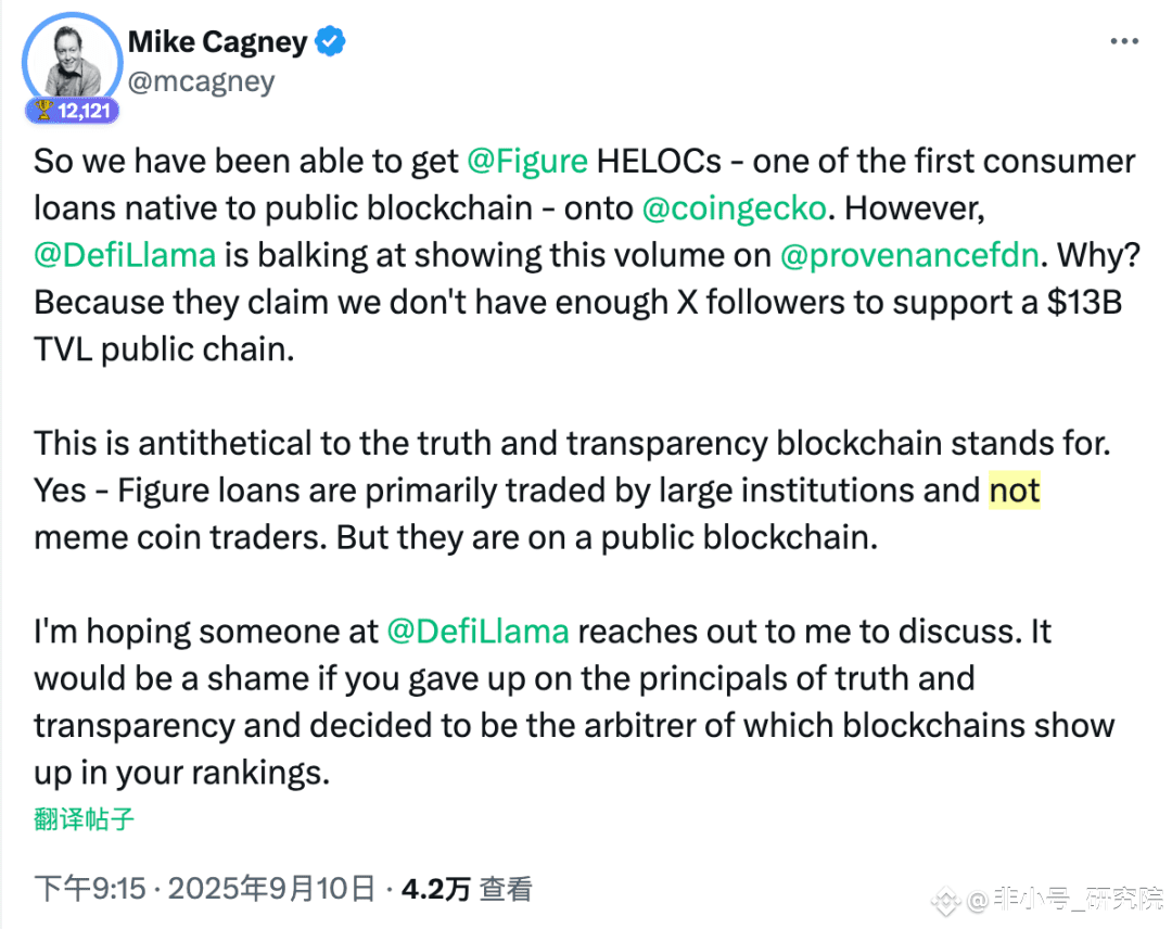 9 月 10 日,Figure 联合创始人 Mike Cagney 在 X 平台率先开火,公开指责链上数据平台 DefiLlama 拒绝展示其 RWA TVL,仅因“社交平台粉丝数不足”,并质疑其“去中心化标准”的公允性。