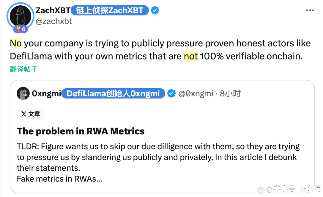 直言 Figure 的操作属于“公然施压”,并明确指出:“不,你们公司正试图用那些并非 100%可在链上验证的指标,公开向像 DefiLlama 这样被证实是诚信的参与者施压。”