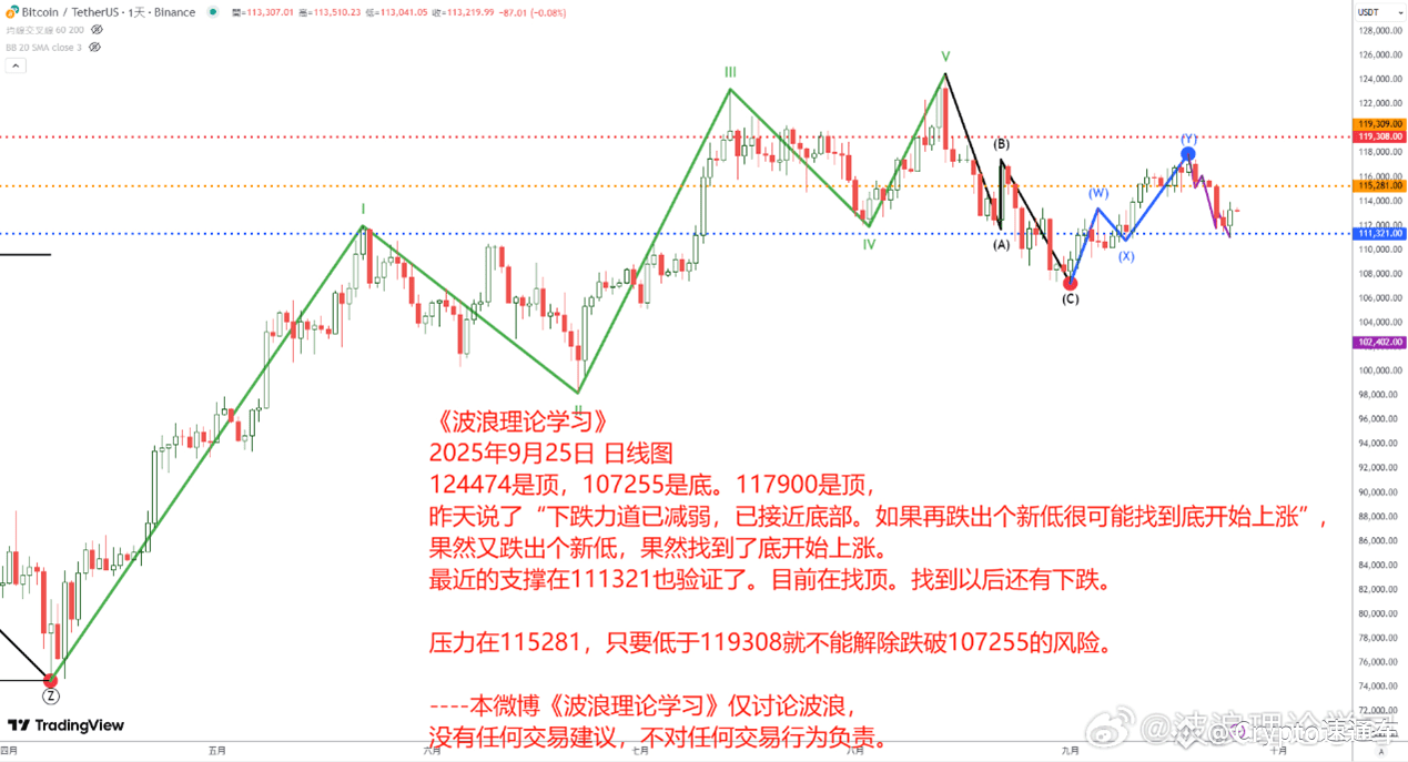124474是顶,107255是底。117900是顶昨天说了“下跌力道已减弱,已接近底部。如果再跌出个新低很可能找到底开始上涨”。果然又跌出个新低,果然找到了底开始上涨。找到以后还有下跌。最近的支撑在111321也验证了。目前在找顶。