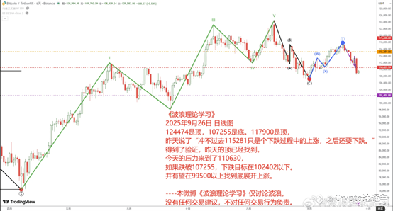 124474是顶,107255是底。117900是顶,昨天说了“冲不过去115281只是个下跌过程中的上涨,之后还要下跌“。得到了验证,昨天的顶已经找到。今天的压力来到了110630
