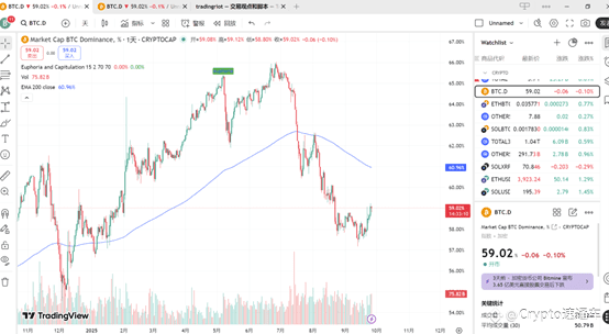 山寨币下跌,BTC.D反弹,压力位60.9%。