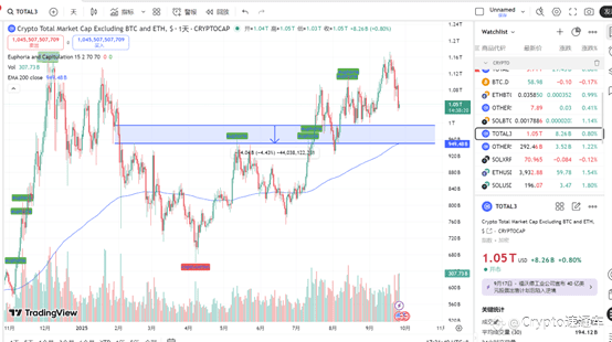 山寨币总市值日线回调中,预计回踩蓝色区域。