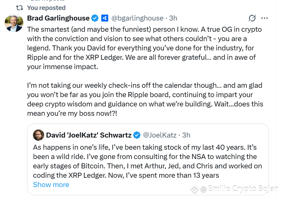Ripple CEO Brad Garlinghouse praised Schwartz as “a true OG in crypto” with unmatched conviction, vision, and humor, crediting him for shaping both Ripple and the broader $XRP Ledger. Garlinghouse added that Schwartz’s new role ensures his deep insights remain central to Ripple’s mission.