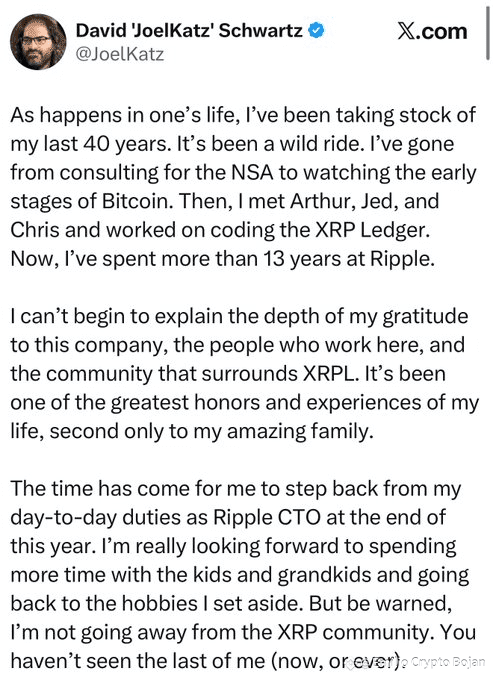 Schwartz, who is widely recognized as one of the original architects of the $XRP Ledger, shared a heartfelt message reflecting on his career journey — from consulting for the NSA to joining Arthur, Jed, and Chris in building the foundations of Ripple. He described his time at Ripple as one of the greatest honors of his life, second only to family.