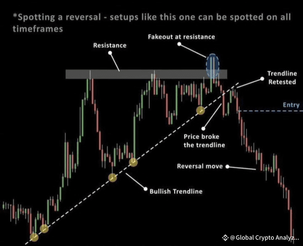 After the fakeout, price breaks below the bullish trendline, signaling weakness in the uptrend.