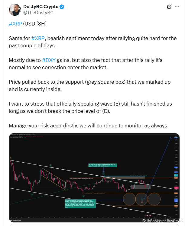 $XRP /USD has entered a corrective phase after a sharp rally, pulling back into a key support zone. Technical signals suggest wave (E) remains incomplete, keeping both bullish and bearish outcomes on the table.