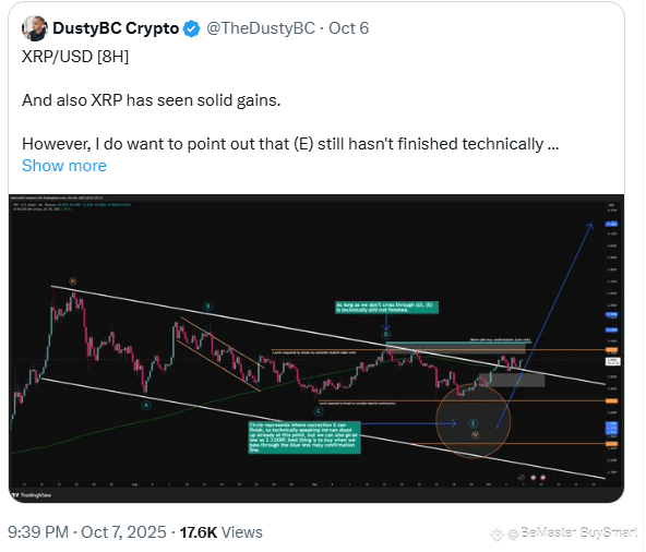 Recent analysis from DustyBC Crypto points out that wave (E) of the current Elliott Wave structure hasn't completed yet, meaning XRP's next significant move could swing either direction. The chart reveals this tug-of-war between bulls and bears with striking clarity.