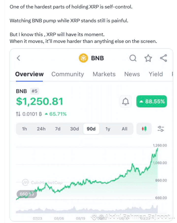 Sanh pointed out that holding XRP requires serious discipline, especially when tokens like BNB are surging. While XRP has remained nearly flat this month — down about 0.08% — BNB has exploded by 25.85%, reaching a new all-time high of $1,347. This rally pushed BNB’s market cap to $177B, overtaking XRP’s $171B.