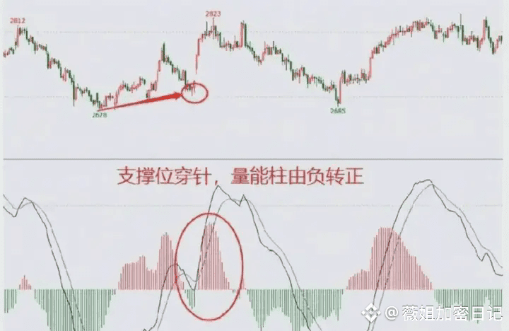 趋势上涨+量能柱始终在0轴之上,表明上涨趋势延续;趋势下跌+量能柱始终在0轴之下,表面下跌趋势延续。