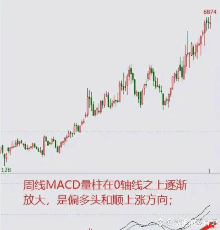 1.MACD量柱一直处于0轴之上,价格出现一波持续上涨,;