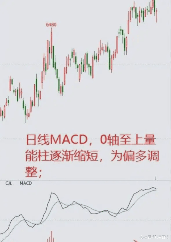 0轴上的量柱由大逐渐缩小,为偏多回调,盘面表现为上升趋势调整;