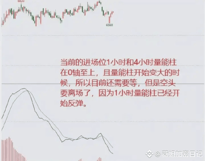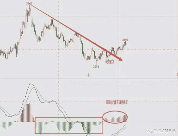 0轴下的量柱由小变大,为偏空趋势,盘面表现为下降趋势;