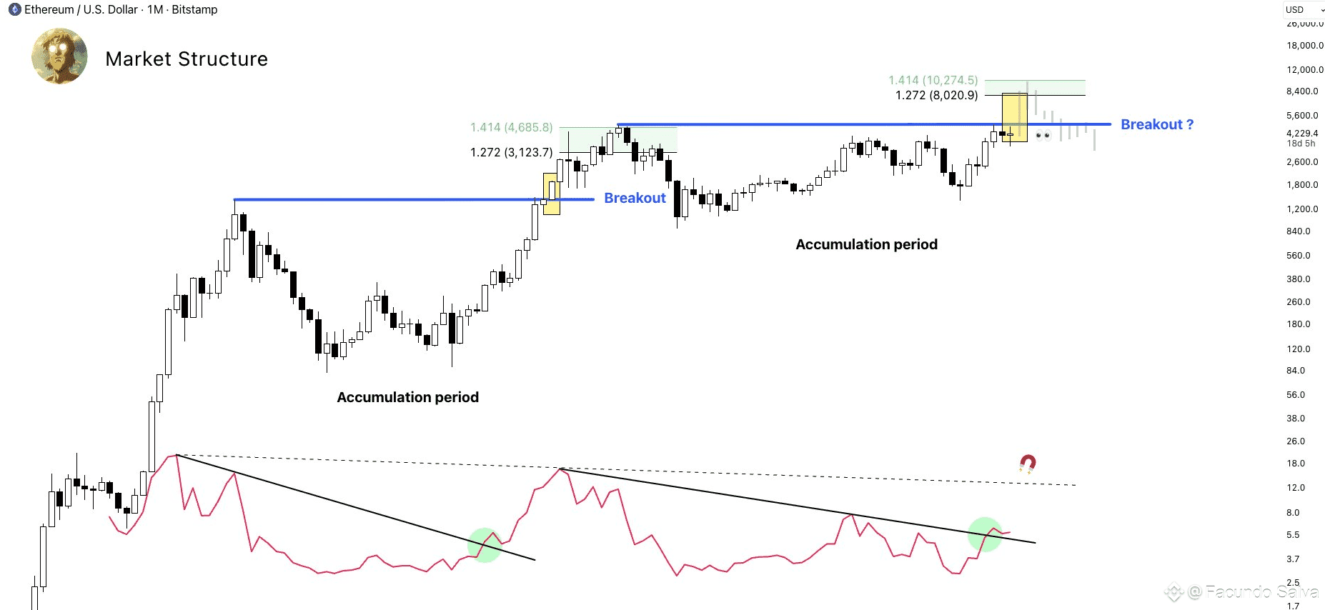 Pero aquí viene la parte que nos devuelve la sonrisa: aunque el corto plazo esté heavy, el gráfico semanal de Ethereum nos está gritando otra cosa. Hay una figura que en el análisis técnico se llama "bandera alcista". Si este patrón se confirma, la matemática nos dice que el precio de ETH podría dispararse hasta los $10,000. No es un deseo, es una proyección basada en la estructura del gráfico. 🚀