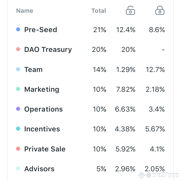 ▫️Its token unlocks and vesting schedule show portions reserved for team and investors have locked allocations that gradually open.