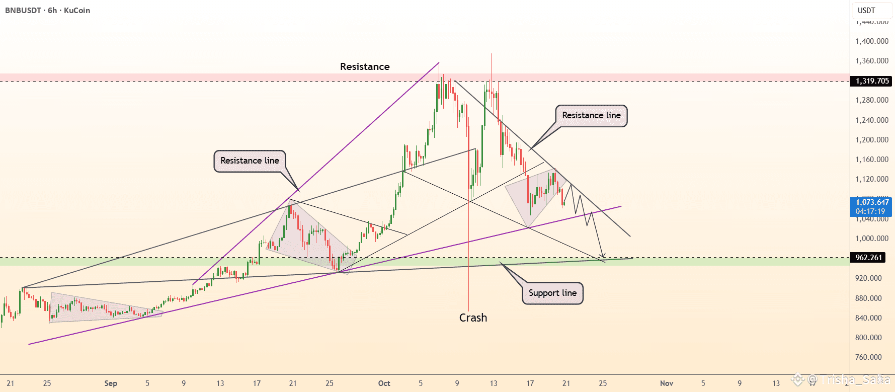 ● BNB/USD continues its decline within a descending structure, repeatedly rejecting resistance near 1,100, signaling sustained bearish control.
