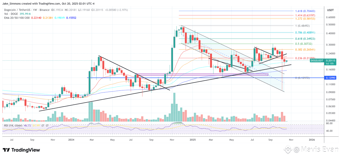 At the moment, Dogecoin trades around $0.20, forming a base. If history repeats, this quiet phase might be the calm before another sharp move higher.