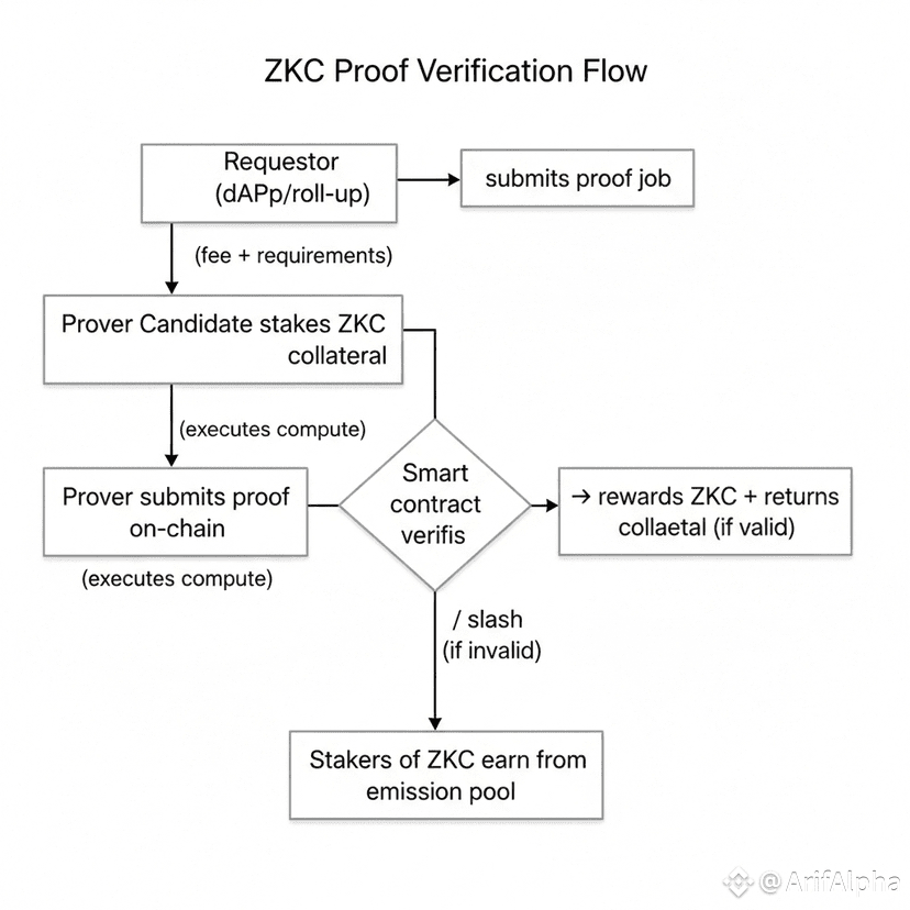 Mustafa runs a proving node. He qualifies, stakes ZKC as collateral, bids on proof-jobs, completes them, and earns ZKC rewards. If he fails (e.g., down-time, invalid proof), his collateral is slashed. So he’s intrinsically motivated to stay reliable.