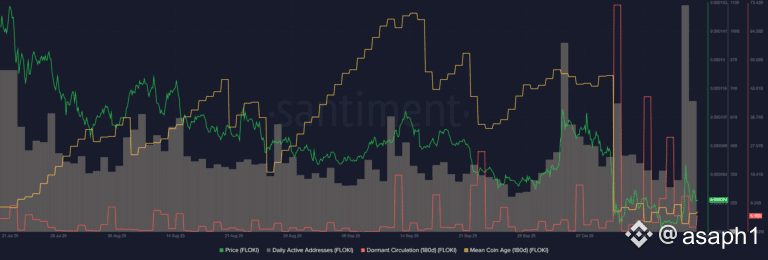 los indicadores de corto plazo y las "tripas" de la red nos contaban otra historia. La presión de compra no era ni fuerte ni constante. Y aquí viene lo más importante: las métricas on-chain (los datos reales de las transacciones) no mostraron que la gente estuviera acumulando FLOKI en sus billeteras. Lo que sí vimos, hace unos días, fue mucho movimiento entre cuentas, lo que es una señal clásica de que la gente estaba vendiendo. 💰💨