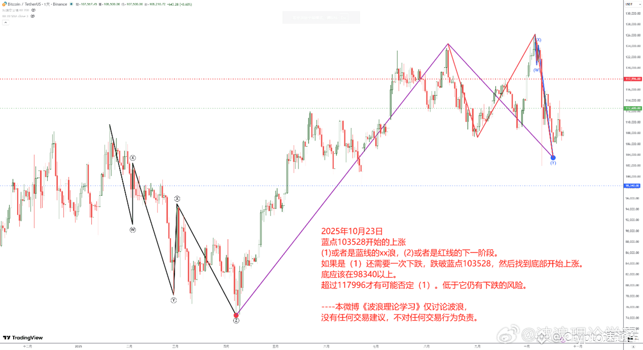(柳玉东认为BTC在震荡中,如果上涨突破117996则不会再跌破103528,如果反弹太弱,可能会再次跌破103528,底部在98340以上。)