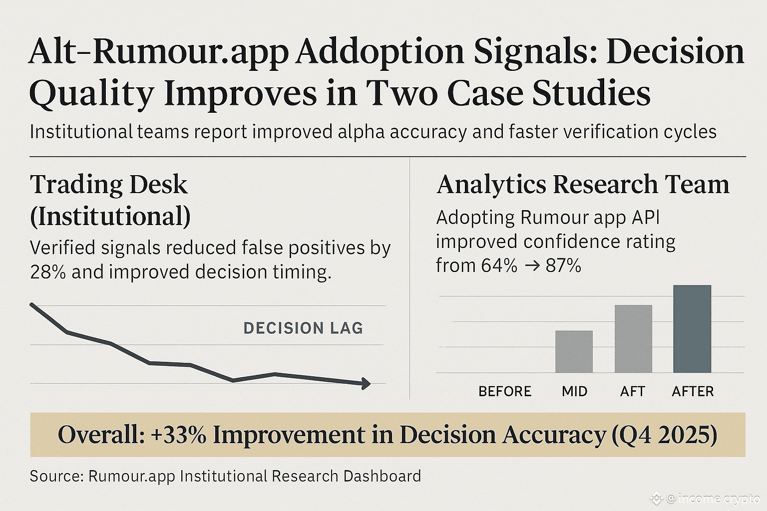 Alt-Rumour.app ने दो केस स्टडी प्रस्तुत की हैं जो दिखाती हैं कि सिग्नल-इंटीग्रेशन से निर्णय-गुण और उपयोगकर्ता भरोसे में उल्लेखनीय सुधार हुआ है, सोशल-प्रूफ आधारित विकास का यह नया चरण है।