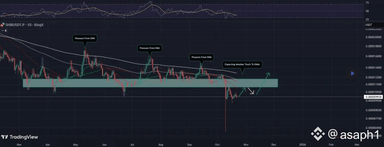 Antes, SHIB tenía un rango verde de soporte súper confiable, pero cayó de ahí. Ahora, ese viejo soporte se convirtió en su nueva meta, en una resistencia que tiene que romper. ¿Y cuál es el gran jefe de la resistencia? La famosa EMA de 200 días (la Media Móvil Exponencial de 200 días). Este indicador es el muro de Berlín para Shiba. 🧱 Desde mayo, cada vez que SHIB ha intentado subir, ¡pum!, se ha estrellado contra esa EMA.