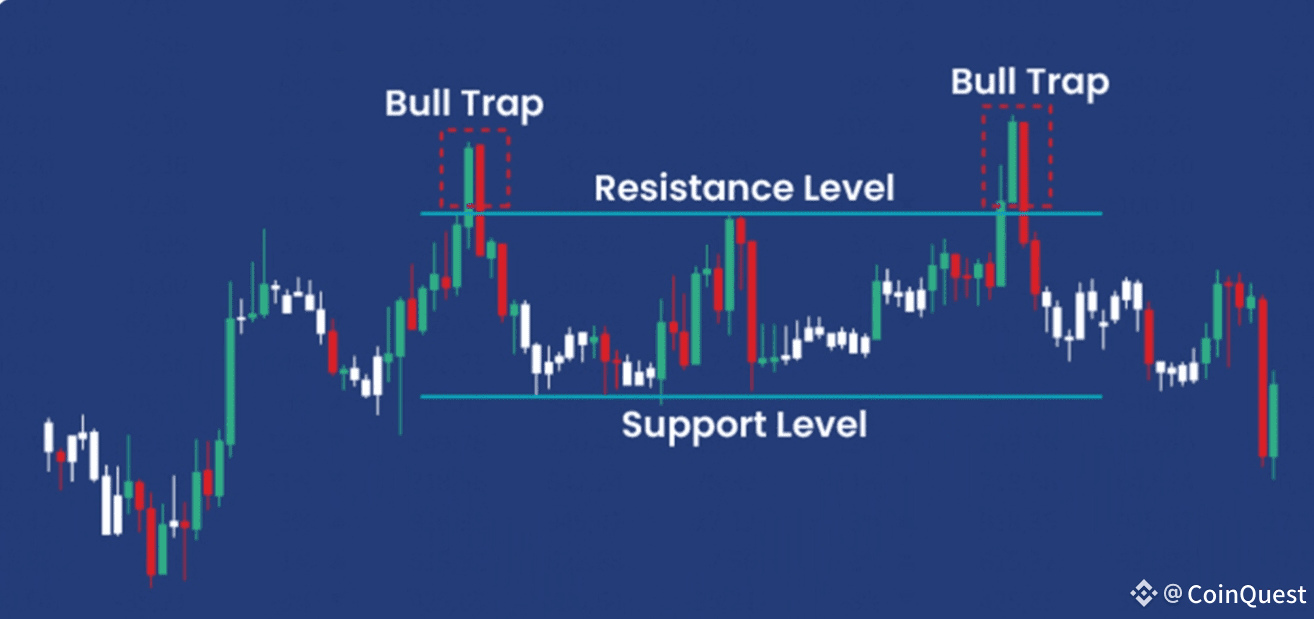 A bull trap typically appears when price breaks above resistance but fails to follow through. The move looks real at first, but volume stays weak, and soon after, price closes back within the prior range — leaving late buyers stuck.
