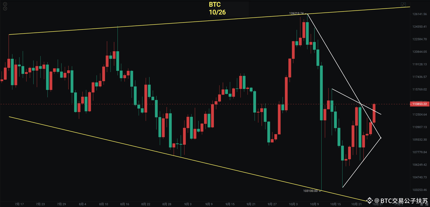 比特币自暴跌后已窄幅震荡近半个月,二次探底插针未跌破前低,当前价格在113700美元附近。本周走势至关重要,将决定后续是震荡上行还是延续调整:周线呈现阳线形态,价格显露出突破布林中轨的迹象,若下周收线能站稳布林中轨上方,则有望向布林上轨发起冲击。从技术面看,目前反弹受阻于斐波纳契0.5回调位,后续若能触及0.6至0.786区间,大概率会先经历一波回调再重启反弹。