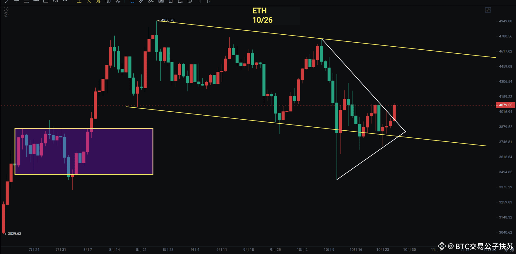 以太坊周线在“双阴夹阳”形态后连续两周收十字星,反弹动能偏弱。周线MACD指标连续两周处于零轴下方,快慢线形成交叉,但价格未跌破布林中轨;日线级别此前呈箱体震荡,后转为下降通道运行,当前价格在4060美元附近徘徊,若能突破4300美元,则有望测试通道上沿。