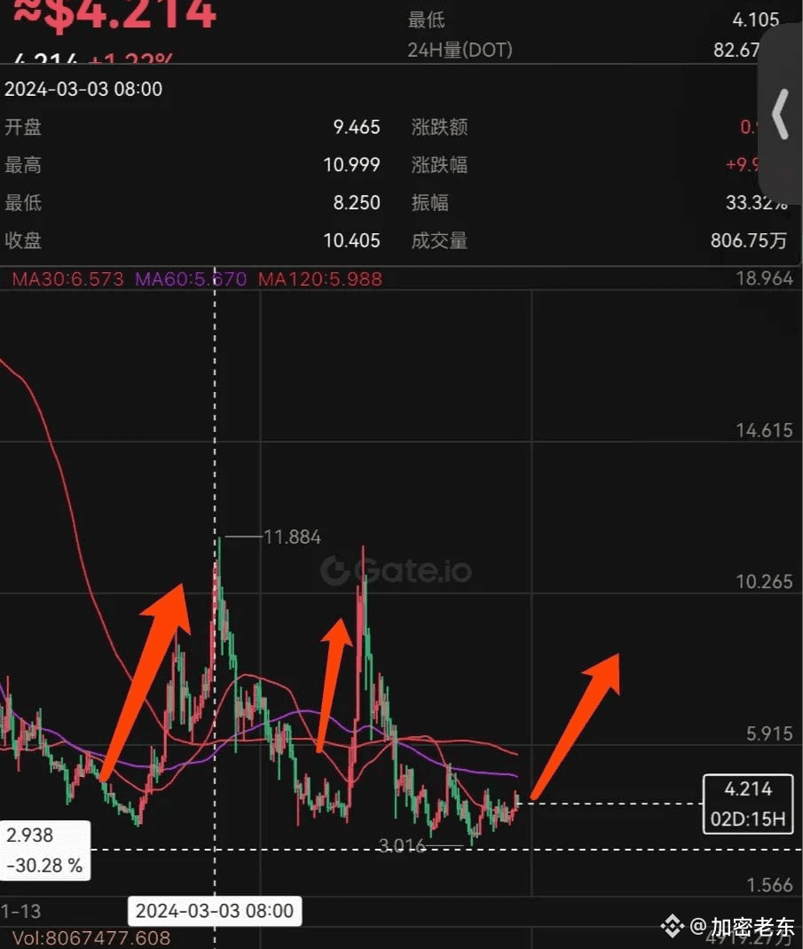 磨得越久爆发越强,以 $DOT为例,第一波行情高点出现在2024年3月3日,第二波行情高点出现在2024年12月3日,相隔9个月,时至今日,底部盘整时间已经9月有余。
