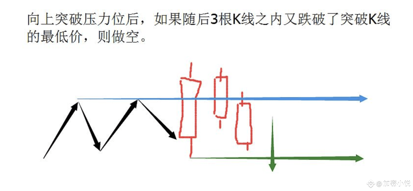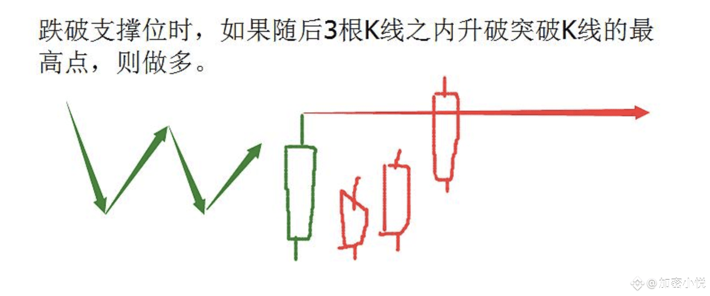 反之亦然,向下跌破前期支撑位时,如果随后3根K线内又涨破了最高价,则做多